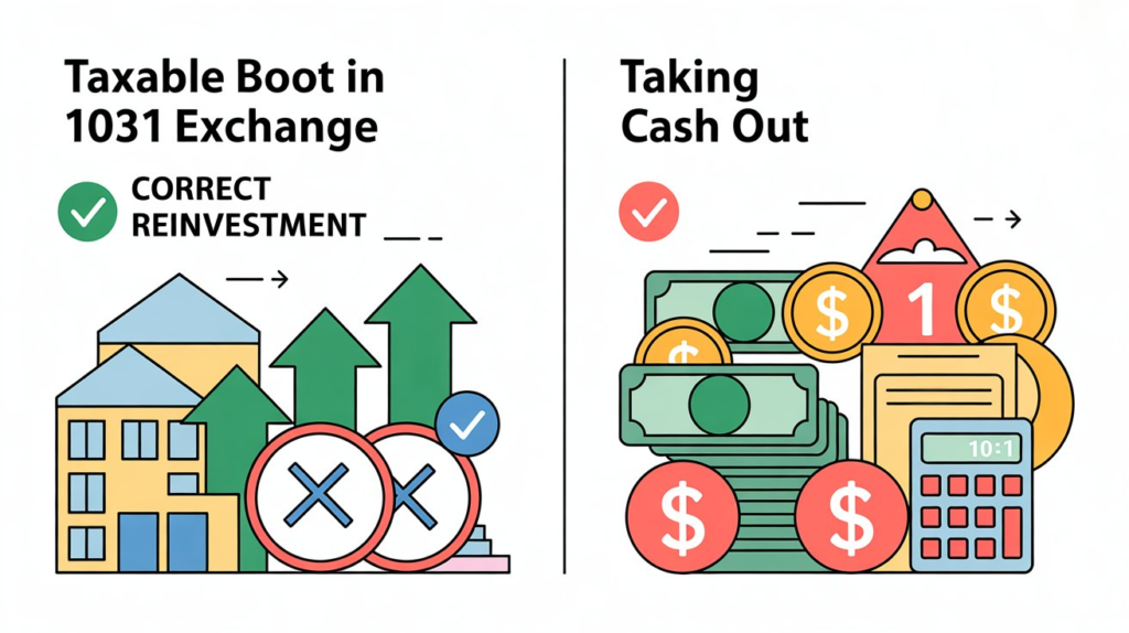If you take any cash or receive property that isn’t “like-kind” (non-like-kind property), that portion is considered taxable boot. Simply put, taking even a small amount of cash out of the exchange could partially trigger capital gains taxes—defeating the purpose of the 1031 exchange.
