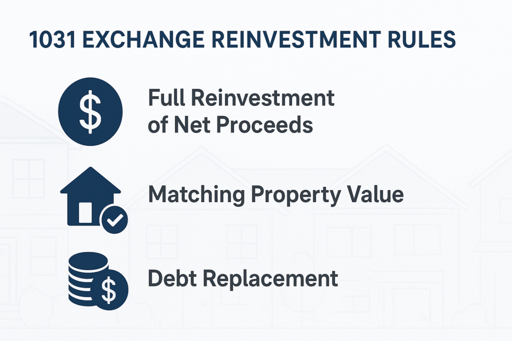 To fully defer capital gains taxes in a 1031 exchange, there are strict reinvestment rules that every investor must follow. Skipping any of these steps could trigger unwanted tax consequences. Let’s break them down.