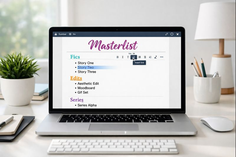 It’s also smart to plan your masterlist in advance. Decide how you want to categorize your content whether by type (fics, edits, series), by fandom, or by theme. Thinking through your structure first saves time later and ensures your masterlist grows smoothly as you add more work, instead of turning into another messy scroll.