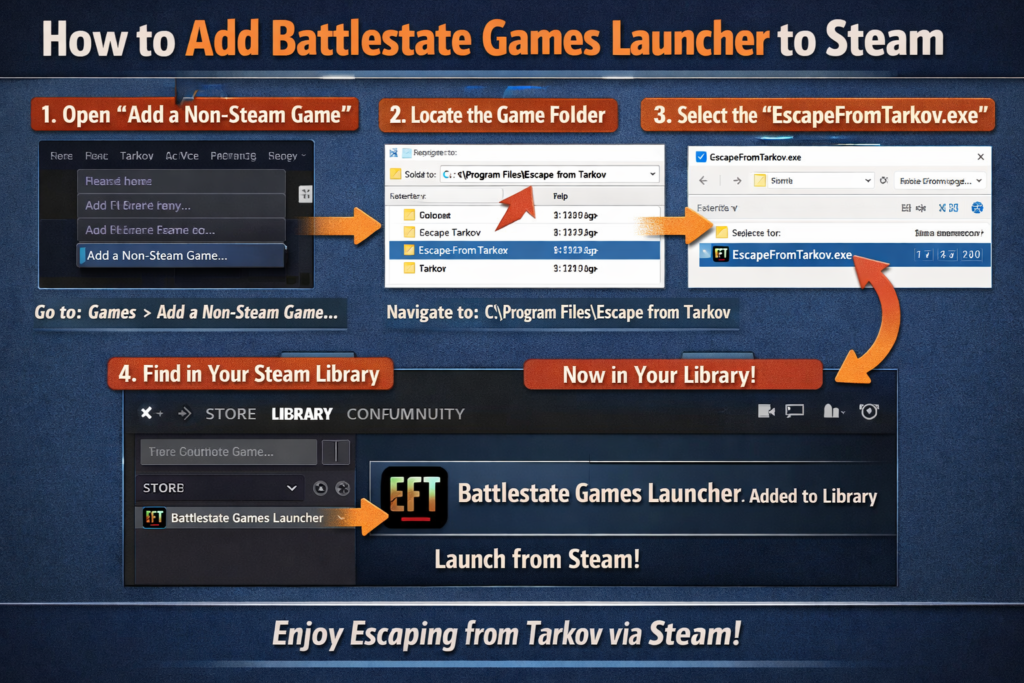 - ▶️ How to Add Escape from Tarkov to Your Steam Library – Tarkov-specific visual guide: https://www.youtube.com/watch?v=Pnc2Yg2P7U4