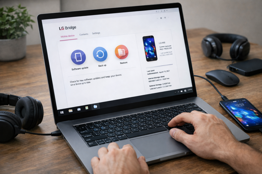 When an update does not appear through system settings, using a computer is the next safest option. LG Bridge allows you to manually check for official firmware updates and install them directly on your LG K40.