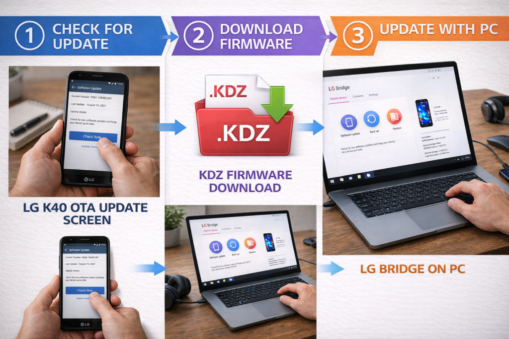 The best and safest way to update the LG K40 today is by using official methods only either through system settings (OTA updates) or LG Bridge on a PC or Mac. These methods rely on LG’s final supported firmware and are designed to protect your device from software corruption.