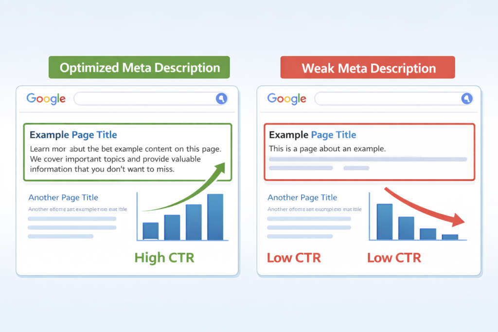 Meta descriptions act as preview copy in search results. A clear, relevant description that matches user intent can significantly improve click-through rate, even when your ranking position stays the same.