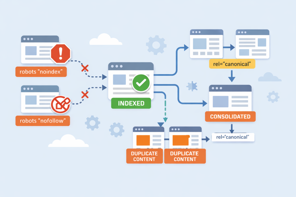 - Robots and canonical tags influence how and whether pages are indexed