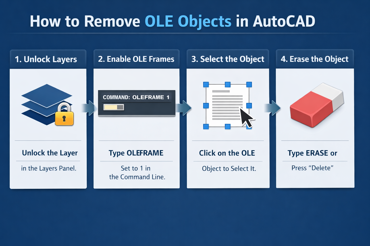 Removing OLE objects in AutoCAD doesn’t require guesswork when the right process is followed. The safest approach is to unlock the correct layer, enable OLE frame visibility, select the object cleanly, and delete it using standard erase commands.