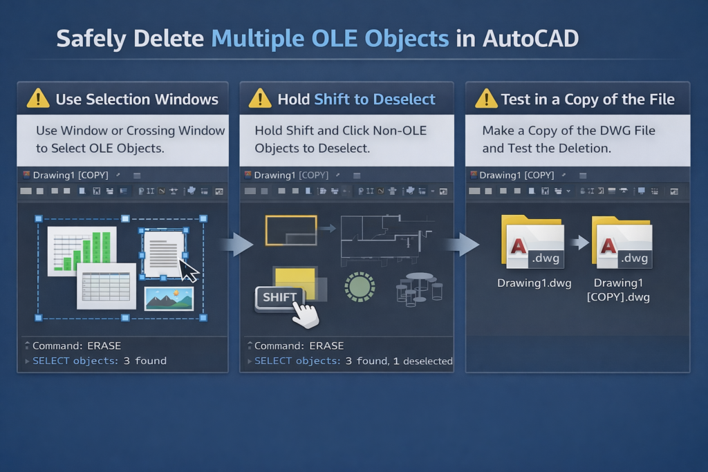 Editing original files without backups is a risk that’s easy to underestimate. OLE objects often contain linked or embedded data that may be difficult to recover once removed. Working on a copy of the drawing gives you the freedom to troubleshoot, test commands, and undo mistakes without jeopardizing critical project files.
