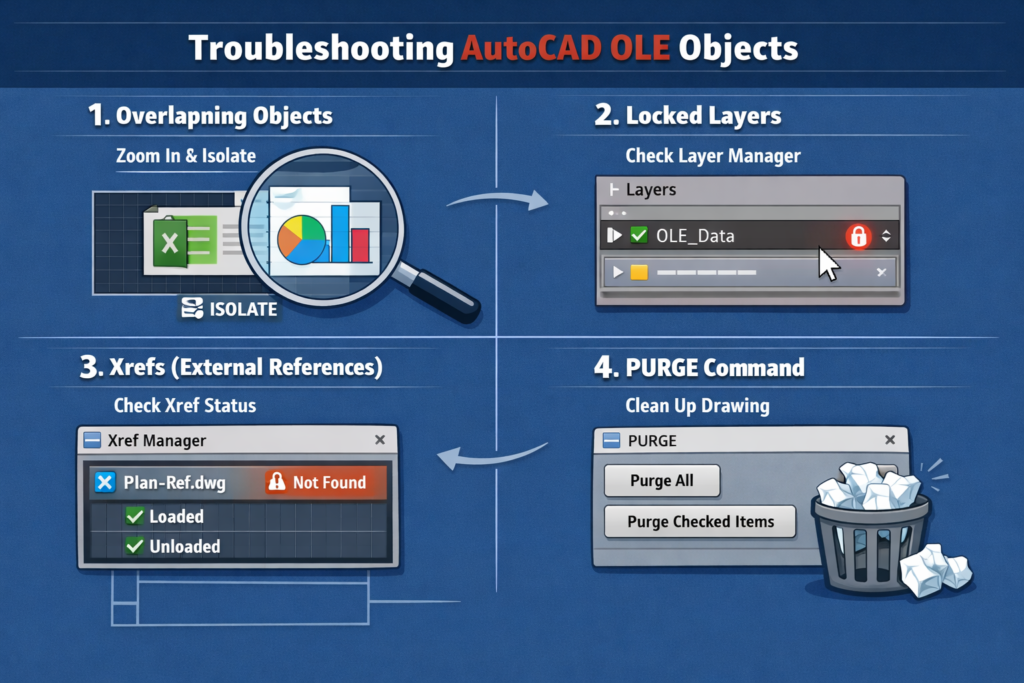 If you’ve ever tried deleting an Excel sheet or Word table inside an AutoCAD drawing and found it strangely untouchable, you’ve already met the frustration of OLE objects. These objects often refuse to select, won’t respond to the ERASE command, or seem to disappear until they suddenly block edits. The problem isn’t you it’s how AutoCAD handles Object Linking and Embedding behind the scenes.