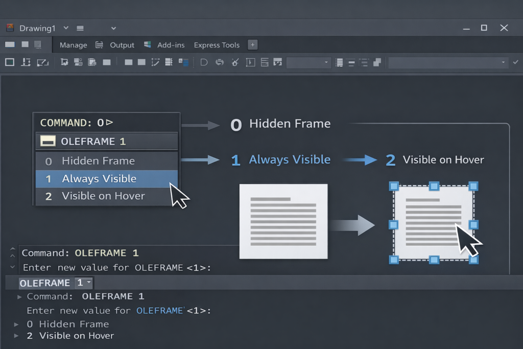 Type OLEFRAME in the command line and press Enter. AutoCAD will prompt you to enter a value. Each value controls how OLE frames behave:
