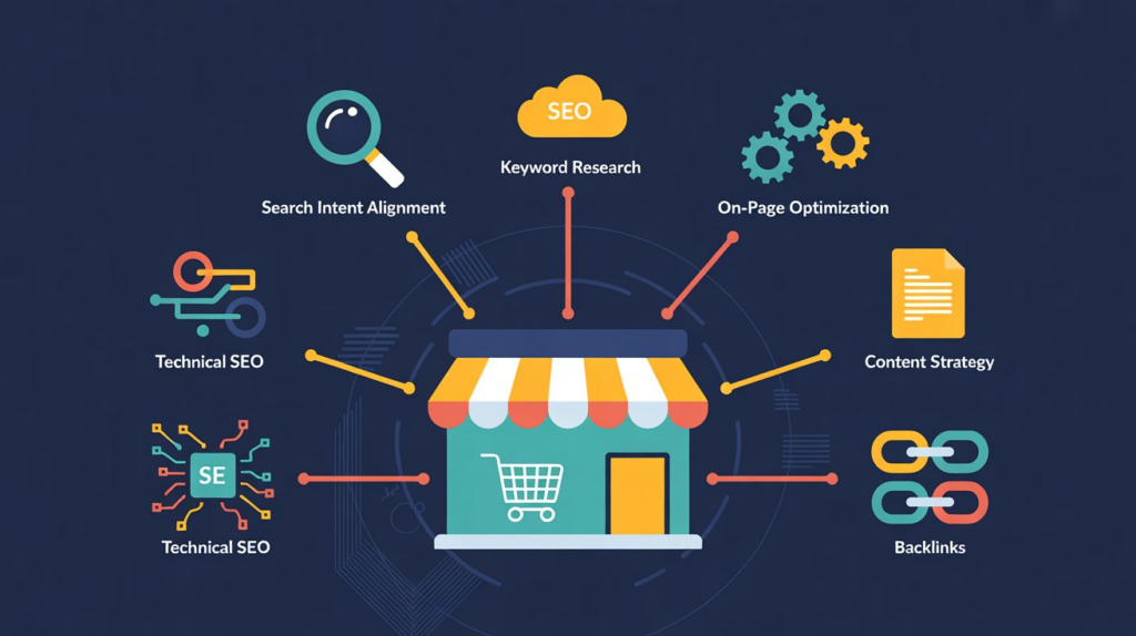 This guide breaks down exactly what e-commerce stores must focus on in 2025 search intent alignment, long-tail keyword targeting, site structure, Core Web Vitals, schema markup, high-quality content, and authority-building strategies. You’ll learn how each component works, why it matters, and how to implement it across your store for consistent, long-term organic growth.