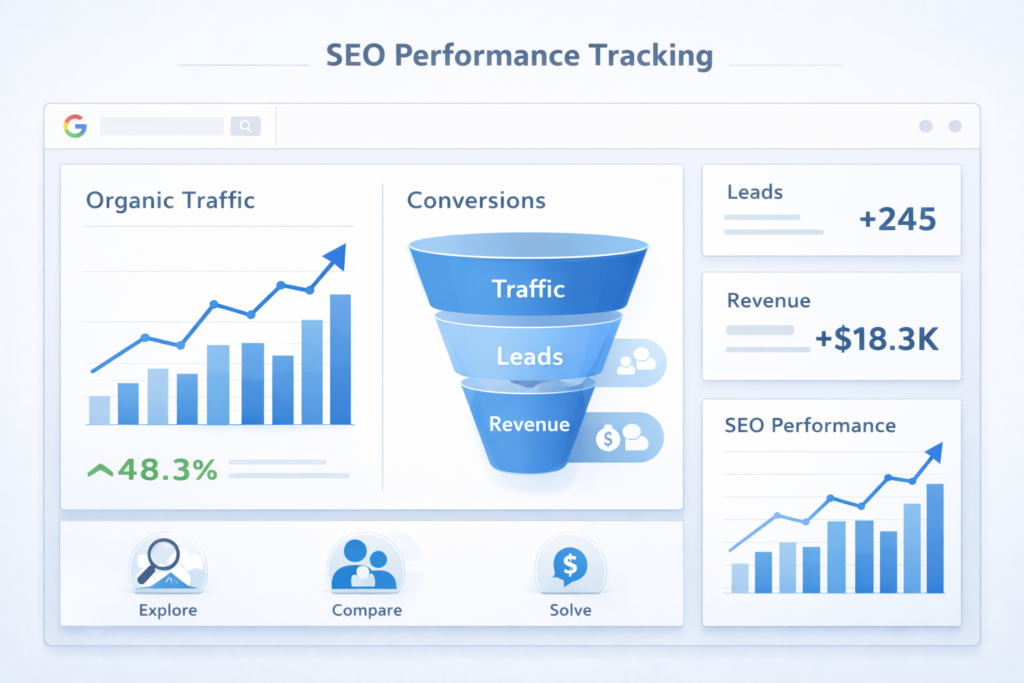 Content must influence the pipeline. Track form fills, demo requests, sign-ups, and assisted conversions tied to organic pages. High-performing SEO content often supports conversions indirectly, making multi-touch attribution essential.